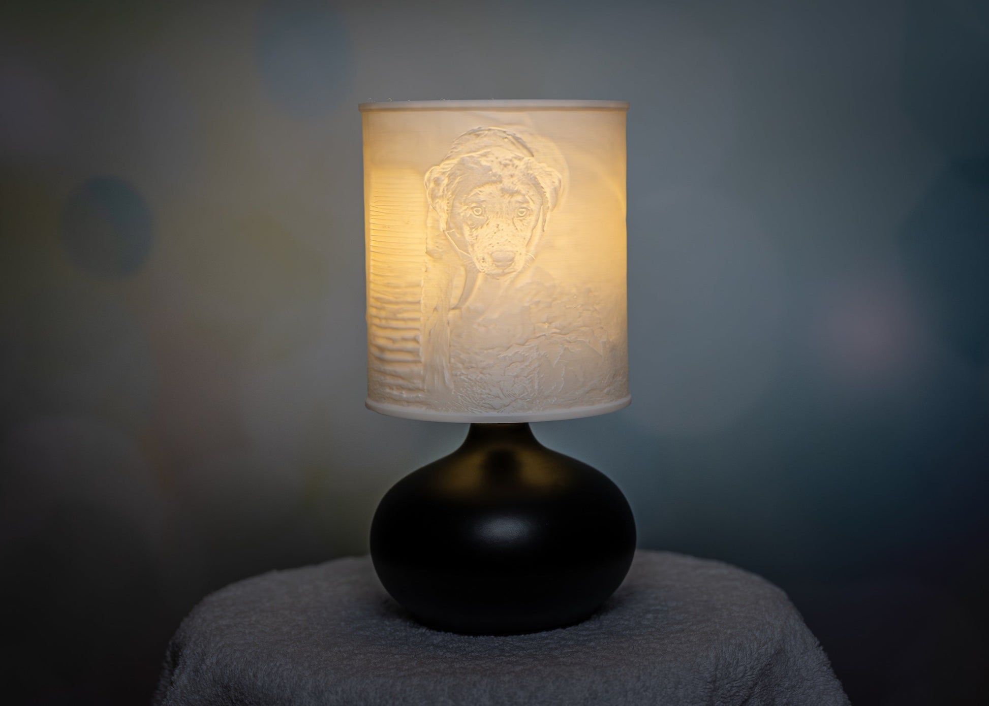 Erlebe deine schönsten Erinnerungen in einem neuen Licht – mit unserer einzigartigen 3D-Relief (Lithophane) Lampe! Der hochwertige schwarze Keramikfuß verleiht der Lampe Stabilität und eine zeitlose Ästhetik, während der individuell gestaltbare 3D-Relief-Schirm deine Fotos oder Motive in faszinierendem 3D-Relief zur Geltung bringt.